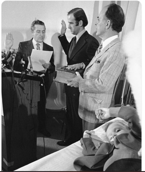 Joe Biden at his swearing-in to the U.S. Senate. The little boy is Hunter. He has skull fractures and a brain injury from the car wreck. Joe made him get dressed up for this photo op because he thought it would be good for his career.