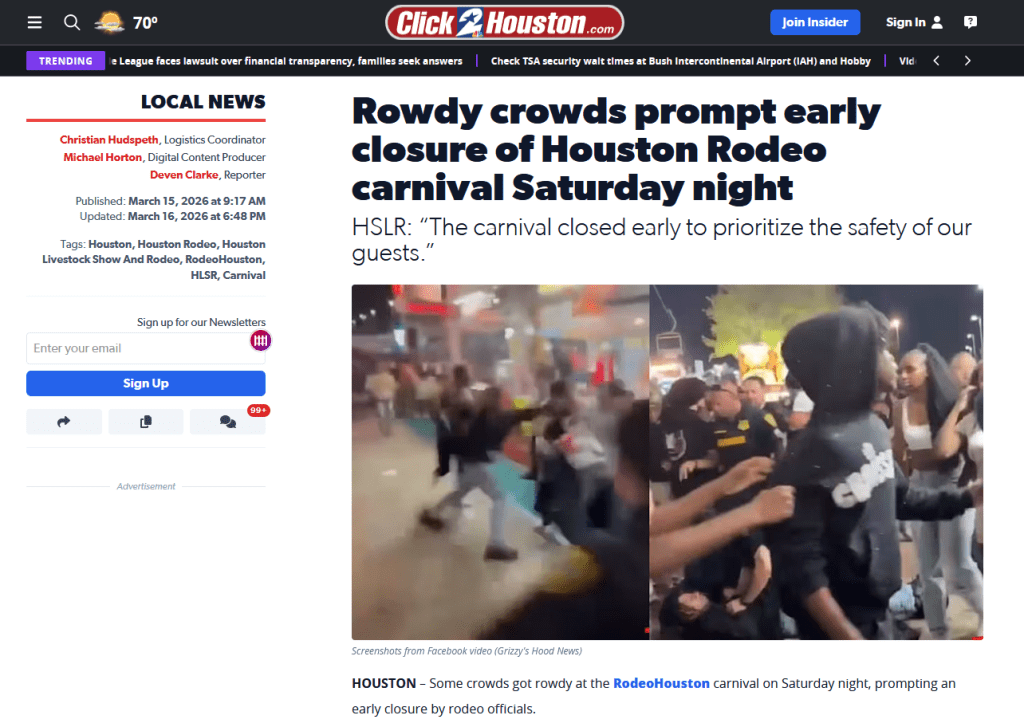 “A riot at a trampoline park. A mall nearly destroyed. A riot at a gated, suburban community pool. Public parks “taken over.” Cruise ship dining rooms become a backdrop to violent melees. A brawl at an Outback Steakhouse. Fights at airport terminals. The yearly Houston Rodeo is ruined. More fights. At concessions. In the parking lot. Wigs fly. Morbidly obese women with their asses showing in public. The rodeo shuts down. New rules for everyone. Daytona Beach spring break devolves into mob violence. More fights. More wigs flying. Gunshots. Human stampedes.”